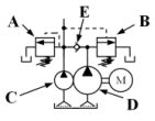 (A)A為溢流閥 (B)B 為卸載閥 (C)C 為低壓小排量泵浦 (D)D 為低壓大排量泵浦 。