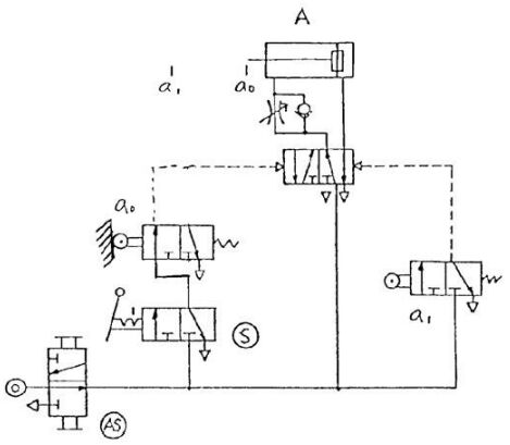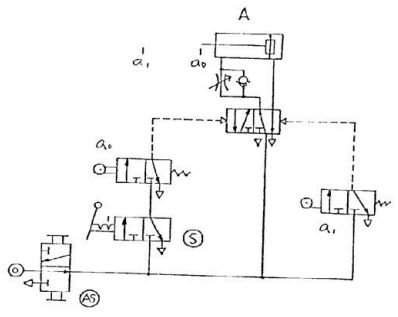 (A)立即切換至原來位置(使產生脈衝訊號)則氣壓缸 A 不會運動 (B)立即切換至原來位置(使產生脈衝訊號)則氣壓缸 A 伸出後停留在前端位置 (C)並鎖在“通”的閥位,則氣壓缸 A 伸出至端點再退回到原來位置後停止 (D)並“鎖”在通的閥位,則氣壓缸 A 連續作往復運動 。