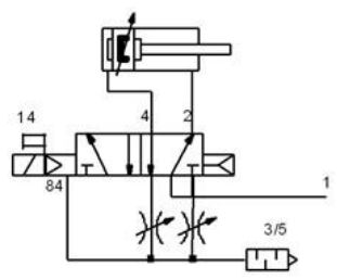 (A)5/2 方向閥驅動單作用氣壓缸運動 (B)5/2方向閥為電磁線圈操作氣動彈簧回位 (C)獨立調節共同排氣附消音器 (D)5/2方向閥需要最低啟動壓力 。