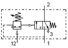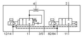 (A)二電磁閥均有強制手動裝置 (B)內部嚮導驅動 (C)二電磁閥均有機械彈簧回位 (D)左邊電磁閥具備壓差功能 。