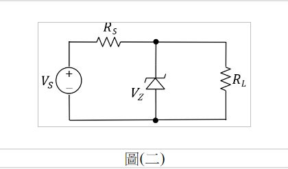 3. 如圖(二)所示之稽納(Zener)二極體穩壓電路,假設=4V,且最大消耗功率=100mW,=10V,負載電路=2k,則使兩端電壓維持在4 V之電阻的最小值約為何?