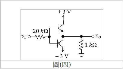 9. 如圖(四)所示之雙極性電晶體電路,假設β=100,NPN電晶體之=0.7V,PN[電晶體之=0.7V,則當輸入電壓=-3V時,輸出電壓為何?