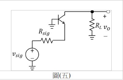 10. 如圖(五)所示為一共基極放大器簡化之交流電路,假設電晶體工作在主動放大區,=1mA,=100,=4k,熱電壓=25mV,求此電路比值約為何?