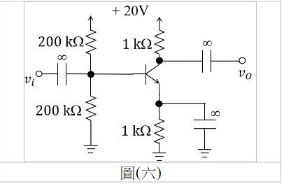 11. 如圖(六)所示之電晶體放大器,假設β=100,熱電壓=25mV且厄利電壓(Early Voltage)= ,求此放大器之電壓增益約為何?