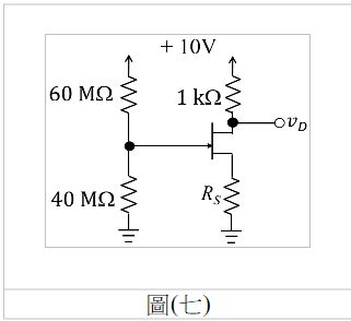 12. 如圖(七)所示之電路,假設N通道JFET工作在夾止飽和區,=+8V,=1V,則為何?
