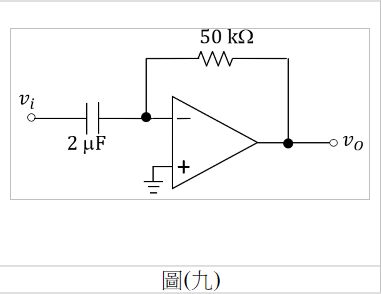 19. 如圖(九)所示理想運算放大器(OPA)電路,假設=0.1sin 400t V,則輸出訊號為何?