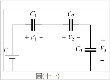 25. 如圖(十一)所示電路,E=60V、C1=10μF、C2=20μF、C3=30μF,求電容器上之電壓分別為何?