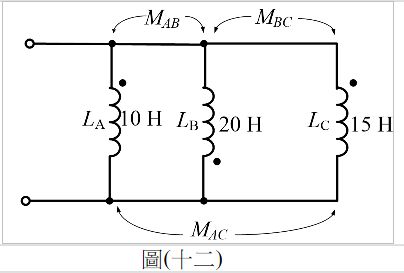 27. 如圖(十二)所示電路,若電感= 10 H,= 20 H, = 15 H,互感 = 3 H,= 3 H,= 1 H,求等效總電感量約為何?