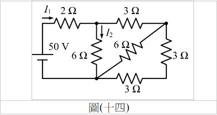 30. 如圖(十四)所示電路,求I1及I2電流值分別為何?