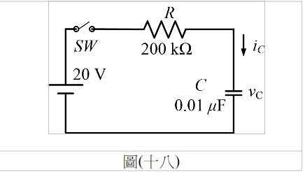 34. 如圖(十八)所示電路,電容器初值為0 V,當SW開關閉合之後,經過6 ms時,試求流過電容器的電流為何?