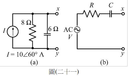 40. 如圖(二十一)所示電路,若將圖(二十一)(a)轉換為等效之圖(二十一)(b),求V,R,C之值為何?