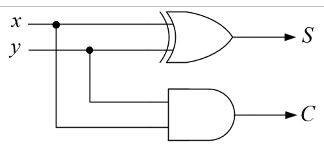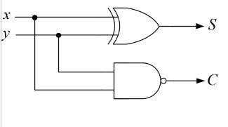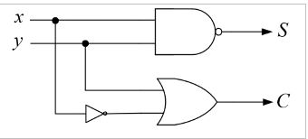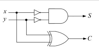 47. 試設計一個半加器,輸入為x(被加數)與y(加數),輸出為C(進位)與S(和),則下列何者邏輯電路可滿足此需求? (A) (B) (C) (D)