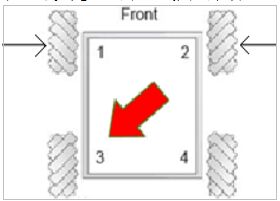 3. 請問下圖麥克納姆輪沿著粗箭頭指示的方向移動,其1~4輪面對轉軸細線所指的轉向為何?
