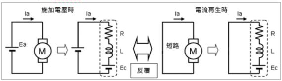 (A)當PWM控制信號處於高電位(On)時,將對馬達外加電壓。 (B)當PWM控制信號處於低電位(Off)時,馬達引腳的兩端將短路。 (C)當PWM控制信號處於低電位(Off)時,線圈的電感會釋放所儲存的磁能,提供保持電流的作用。 (D)當PWM控制信號處於低電位(Off)時,在相對於電感L和電阻R的時間常數足夠短的週期內,反覆外加電壓並且馬達兩端反覆短路時(即PWM控制信號持續作用),流過的電流無法視為定值。。