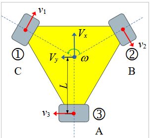 41. 針對下圖之三輪全向底盤運動模型,若 ,ω = 0,對於底盤運動的敘述何者錯誤?