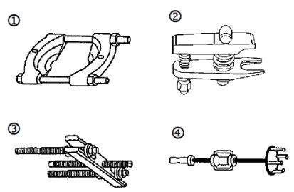 18. 如圖所示的拉出器特殊工具中,下列何者適用於拆卸轉向橫拉桿的接頭? (A)① (B)② (C)③ (D)④。