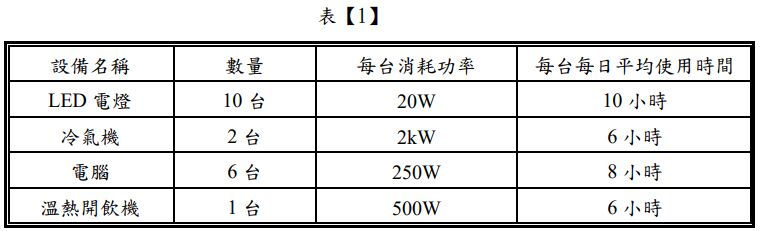 一、有一間辦公室的用電設備數量、每台消耗功率及每台每日平均使用時間如表【1】所示, 若每個月上班以20天計算,每度電費為4元,則每個月需要繳交多少元的電費?