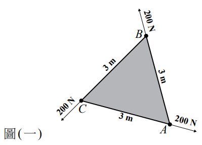1. 如圖 ( 一 ) 所示,於三角形頂點 A、B 及 C 沿三邊線方向分別施加 200 N 之力,下列敘述何者正確?(A) 合力為0,對A 點合力矩為0(B) 合力不為0,對A 點合力矩為0(C) 合力為0,對A 點合力矩不為0(D) 合力不為0,對A 點合力矩不為0