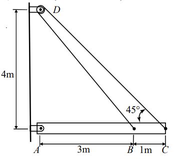 3. 有一水平均勻桿重5.2N,A點為銷釘,繩繞過滑輪D,連接於B、C點處,如圖(三)所示,若系統處於平衡狀態,則A點水平方向的支撐力為多少N?( = 1.414) (A) 1.5 (B) 2.0 (C) 2.6 (D) 3.2