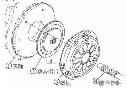 6. 圖 ( 四 ) 為一單片雙面乾式離合器,離合器片的平均有效直徑 d 為 0.4 m,壓板作用在離合器片之力為 2000 N,假設離合器片與飛輪及壓板間之靜摩擦係數 μs 皆相同,當傳遞 扭力為200N-m時離合器片即將打滑,則μs為多少? (A) 0.125(B) 0.25 (C) 0.5 (D) 1.0