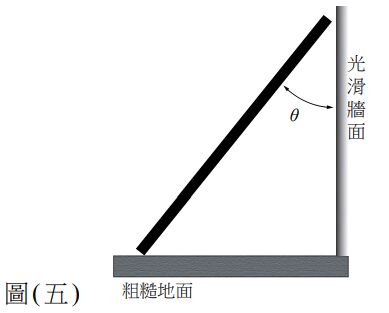 7. 某甲30kg重,將一長5m、質量10kg之均質梯子,依靠光滑垂直牆面,梯與牆面間的夾角為 θ,如圖 ( 五 ) 所示。若梯子與地面間之靜摩擦係數 μ s 為 0.375,當甲站立於梯子中點處且梯子不會滑動,則tan θ最大為多少?(設重力加速度 g = 10m/s2 ,tanθ= )(A) 0.6(B) 0.75 (C) 0.9 (D) 1.33