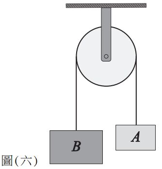 8. 如圖 ( 六 ) 所示,A 與 B 質量分別為 10 kg 與 30 kg,下列敘述何者正確?( 設重力加速度 g=10m/s2 ,忽略滑輪與繩索之摩擦及質量)(A) A之加速度大小為3.75m/s2 (B) A之加速度大小為5m/s2 (C) 繩子張力為50N (D) 繩子張力為100N