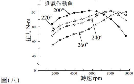 13. 圖(八)為車輛引擎在不同轉速時進氣作動角(進氣行程曲軸轉角)與引擎扭力之關係圖,有關進氣作動角與引擎性能之敘述,甲:「當進氣作動角較小時,引擎在低轉速時有較大扭力輸出」; 乙:「當進氣作動角較大時,引擎在高轉速10000rpm時有較大馬力輸出」,下列何者正確? (A) 甲正確,乙正確 (B) 甲正確,乙錯誤 (C) 甲錯誤,乙正確 (D) 甲錯誤,乙錯誤