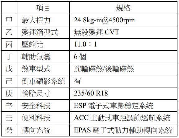 27. 一車輛規格如表(一),下列答案選項中的哪一項皆是與底盤系統有關的規格敘述? (A) 甲、乙、丁、戊、癸 (B) 乙、戊、庚、辛、癸 (C) 乙、丙、己、庚、辛 (D) 甲、丙、丁、己、辛