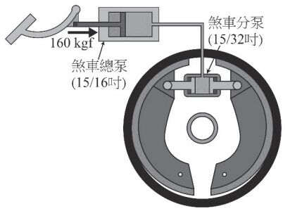 38. 如圖( 十二) 所示之小型汽車煞車系統,總泵活塞直徑為 15 / 16 吋,煞車分泵活塞直徑為 15 / 32 吋,若煞車踏板產生之總泵推桿推力為160kgf如圖(十二)所示,則分泵活塞輸出力為多少kgf? (A) 30(B) 40 (C) 50 (D) 60