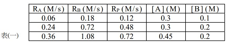 11. 已知A與B反應生成P的反應式如下:xA+yB→zP。若於某溫度T℃下 RA與RB分別為 A、B之消耗速率,RP則是P之生成速率,又各反應速率與濃度之關係如表(一)。另外, 若前述反應之速率方程式可表示為:R= k × [ A ] a × [B] b ,其中k表溫度T時之速率常數, [A]、[B]則分別為A與B之體積莫耳濃度(M),則下列何者正確?(A) a+b=4 (B) 0.2mol的 A與0.45mol的B反應,完全反應後P的理論產量為0.4mol (C) x+y+z=6 (D) k=4(M– 2 ·s –1 )