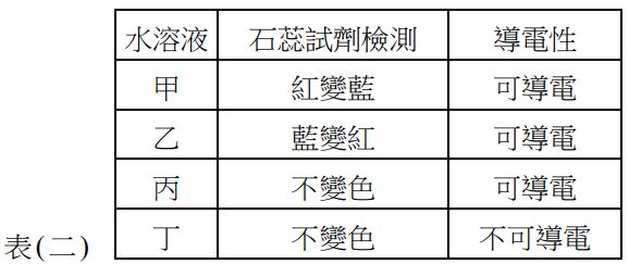 14. 甲、乙、丙、丁四種水溶液,其酸鹼性和導電性的測試結果如表 ( 二 ) ,則甲、乙、丙、丁可能是以下哪種物質?(A) 甲:氯化鈉,乙:鹽酸,丙:葡萄糖,丁:氫氧化鉀 (B) 甲:氫氧化鉀,乙:鹽酸,丙:氯化鈉,丁:蔗糖 (C) 甲:鹽酸,乙:氫氧化鉀,丙:酒精,丁:氯化鈉 (D) 甲:氫氧化鉀,乙:氯化鈉,丙:醋酸,丁:酒精