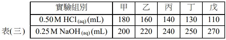 24. 在 25℃下取0.50 M HCl ( aq )與0.25 M NaOH( aq )進行反應熱的測定。若反應前後水溶液總體積不變,水溶液的比熱及密度與水相同,且所有反應熱均由水溶液吸收,則下列五組 實驗(如表(三)),哪些實驗組別的結果會得到相同的溫度? (A) 甲、丙 (B) 甲、丁 (C) 乙、丁 (D) 乙、戊