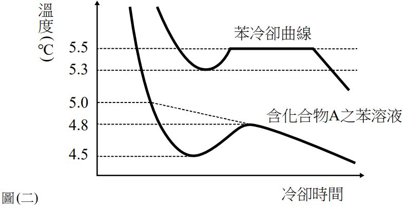 25. 利用凝固點下降實驗,可以計算出物質的分子量。某天小瑜發現實驗室中有一瓶藥品的標籤掉了,為了測定此化合物 A 的分子量,小瑜取 1.0 g 化合物 A 加入 100.0 g 苯中完全溶解,測得其凝固點之冷卻下降曲線如圖 ( 二 ) ,若此化合物 A 在苯中不揮發、不解離也不發生反應,則其分子量為多少?(苯的凝固點下降常數Kf為5.1℃·m–1 ) (A) 102 (B) 84 (C) 72 (D) 64