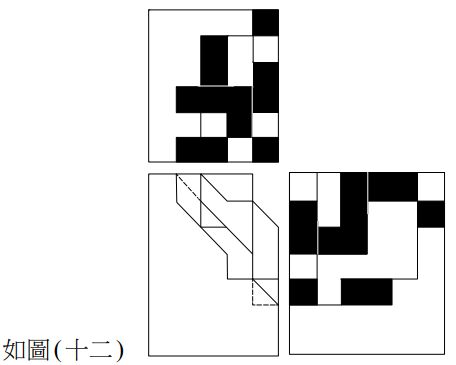 40. 建築師Chacha在臺東美術館設計的提案階段,將建築物的量體以三視圖表示,如圖(十二), 圖中的黑色部分係分佈於立面上的各種單斜面。若欲求得這些斜面的真實大小,下列何者屬 於正確的輔助視圖?