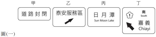 1. 圖 ( 一 ) 為臺灣道路常見的交通標誌,以下甲、乙、丙、丁各標誌之底色依序排列,下列何者正確? (A) 橙、藍、綠、藍 (B) 橙、藍、棕、綠 (C) 紅、棕、綠、綠 (D) 紅、藍、棕、綠