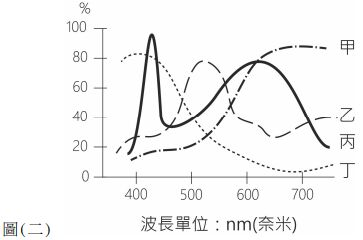4. 圖 ( 二 ) 為甲、乙、丙、丁四種光源的波長與振幅分布,何者應用在蔬果攤上可以讓綠色 蔬果看起來更具新鮮感? (A) 甲 (B) 乙 (C) 丙 (D) 丁
