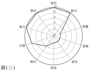 5. 有一款產品經過市場調查後,欲呈現出如圖 ( 三 ) 的色彩意象,下列哪一種色彩最符合此意象? (A) 紅色 (B) 藍色 (C) 綠色 (D) 黃色
