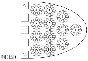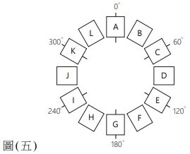 11. 圖 ( 五 ) 為透過 HSB 色彩模式,在飽和度 ( S ) 與亮度 ( B ) 皆固定的條件下,進行多色相的 配色,下列敘述何者正確? (A) 色樣C、J、H分別為紅、藍、紫,形成銳角三角配色 (B) 色樣K、A、I可形成兩組對比色與一組類似色的配色 (C) 色樣A、I、E可形成具強烈鮮明的三組對比色的配色 (D) 色樣G、J、D,其中色樣G與色樣J、D形成對立色