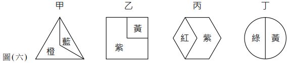 13. 圖(六)甲、乙、丙、丁四組配色中,哪些配色組合符合哥德(Goethe )所提的色彩面積調和理論? (A) 甲、乙 (B) 丙、丁 (C) 乙、丙 (D) 甲、丁