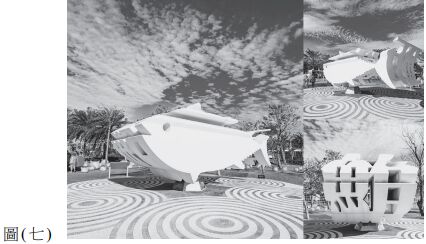 27. 圖(七)為日本設計師福田繁雄( Shigeo Fukuda )創作的雕塑作品,其視覺效果主要運用何種構成形式? (A) 融合漸層效果引發出雕塑作品的空間感知 (B) 採用重複排列圖案強調雕塑作品的節奏感 (C) 利用比例和對稱配置創造穩定的視覺效果 (D) 透過形狀與空間配置引導多角度錯位視覺