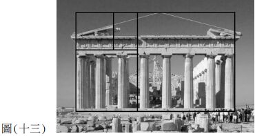 41. 圖(十三)為建於西元前5世紀的帕特農神殿( Parthenon ),是古希臘祭祀雅典娜女神之殿; 此神殿屋頂最高點到地面高度、以及建築物的寬度,二者的結構比例約為 1:1.618,下列何者與此比例有關?(A) 蜜蜂築巢的六角蜂房結構 (B) A3影印紙長度與寬度的比例 (C) 鸚鵡螺外殼切面螺旋結構 (D) 貝魯數列前項與後項的比值