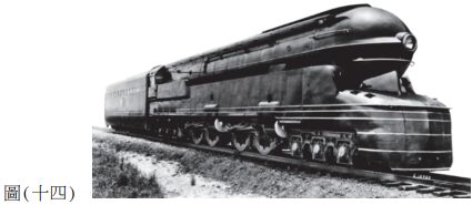 46. 圖(十四)為設計博物館展出的一張蒸汽火車照片,此張照片大約拍攝於1940年代左右, 與這張照片有關的敘述,下列何者正確?(A) 從蒸汽火車的造形推斷,應屬於新藝術時期的設計風格 (B) 此蒸汽火車的設計者曾提出「Less is more」的設計名言 (C) 此蒸汽火車的圓弧狀造形,曾被視為後現代主義的象徵 (D) 蒸汽火車的外形設計具流線型特徵,有仿生設計的形式