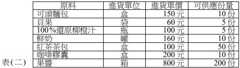 4.陽光民宿所供應早餐多是以現成品為主,客人可以挑選一種麵包搭配一個果醬和一杯飲料。表(一)為4月1日5間單人房的早餐點餐內容,而這些食材的進貨成本如表(二)。民宿當日每客早餐的平均成本是多少元?