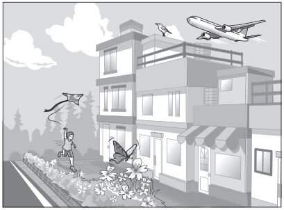 1. Look at the picture. A________ is flying over the houses.(A) bird(B) butterfly(C) kite(D) plane