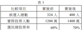3. 某國實施不在籍投票,讓無法返回戶籍地的選民,可透過網路投票。表 1 是該國實施這項制度前、後的相關統計資料。依據表 1,若不考慮該國其他情況,上述制度實施後, 對於選民投票參與的影響,下列推論何者最合理? (A)不在籍投票明顯提升選務工作效率,使選民更願意參與投票 (B)科技進步增加選民投票的便利性,有助於選民表達政治意志 (C)不在籍投票有助於年輕世代參與選舉,使選民總投票率增加 (D)實際投票人數增加,顯示社會大眾對民主運作的滿意度提升