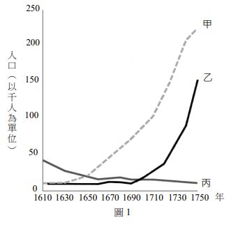 15.圖 1 是 1610 到 1750 年間,北美洲東岸某殖民地印第安人、白人及非裔三個不同族群人數的變化趨勢。圖中甲、乙、丙三條線分別代表: (A)印第安人、白人、非裔 (B)白人、非裔、印第安人 (C)白人、印第安人、非裔 (D)非裔、白人、印第安人