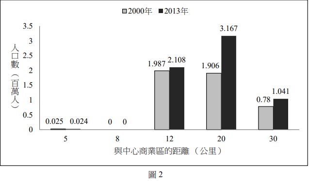 25.某人想要了解美國休士頓都會區的都市發展歷程,因此蒐集 2000 年與 2013 年該都會區的人口資料,並繪製成不同年度都會區的人口分布統計圖(圖2)。該圖最適合以下列哪個地理概念解釋? (A)都市化 (B)都市計畫 (C)都市成長 (D)都市機能