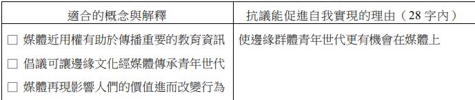 46. 甲的主張最適合以媒體作用的哪項相關概念解釋 ? 為何抗議行動有助青年世代自我實現?請先勾選適合的概念與解釋,並依據勾選之解釋說明理由。