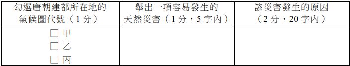 63. 不考慮長期氣候變遷的情況下,在答題卷中勾選一個最可能是唐朝建都所在地的氣候圖代號,並且以氣候的角度,分析該地容易發生的一項天然災害,並說明該災害發生的原因。