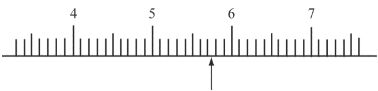 4以規格15公分長的鋼尺量測工件,如下圖的箭頭位置的目測尺寸約為?(A)5.75mm(B)57.5mm(C)57mm(D)58mm。